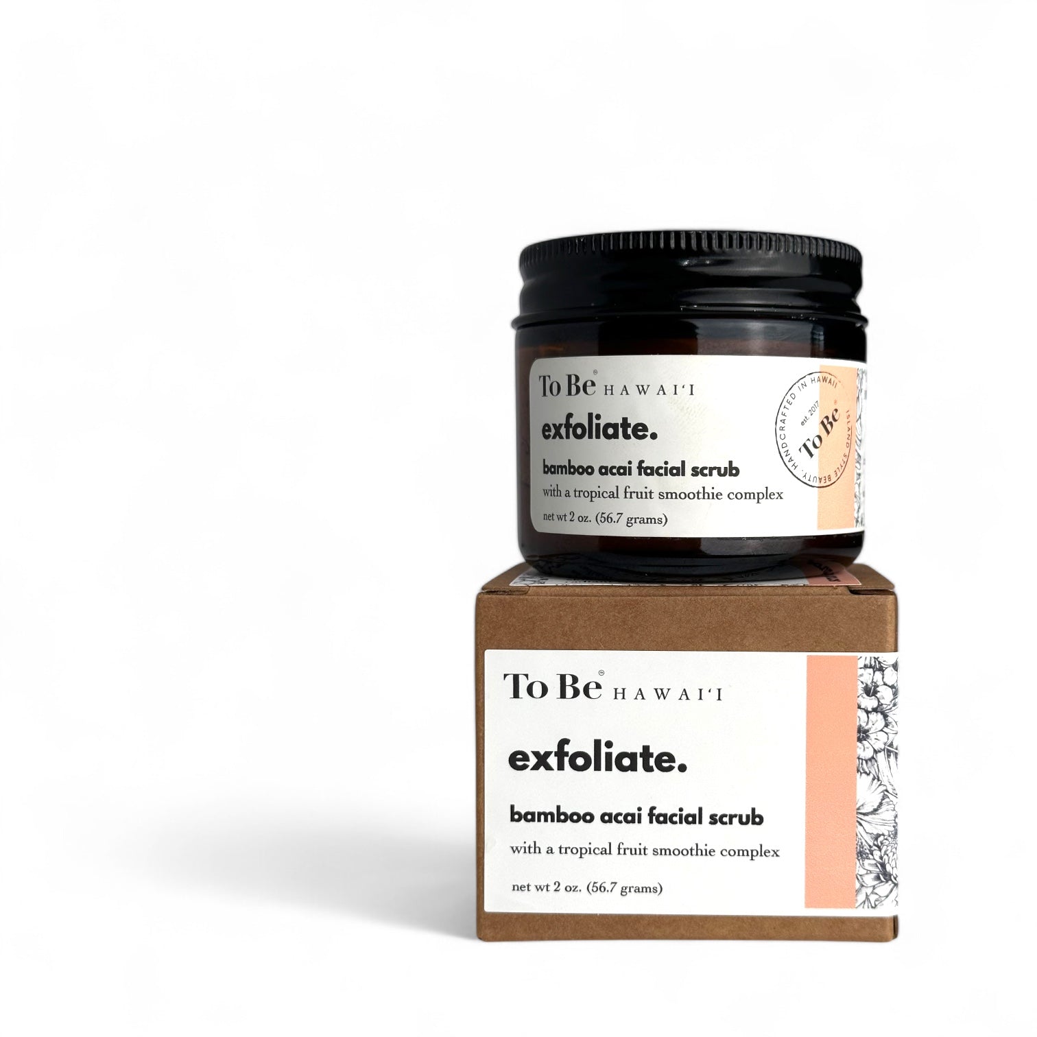 2oz. re-useable amber glass jar with a black metal lid. Packaged in a recyclable Kraft box.