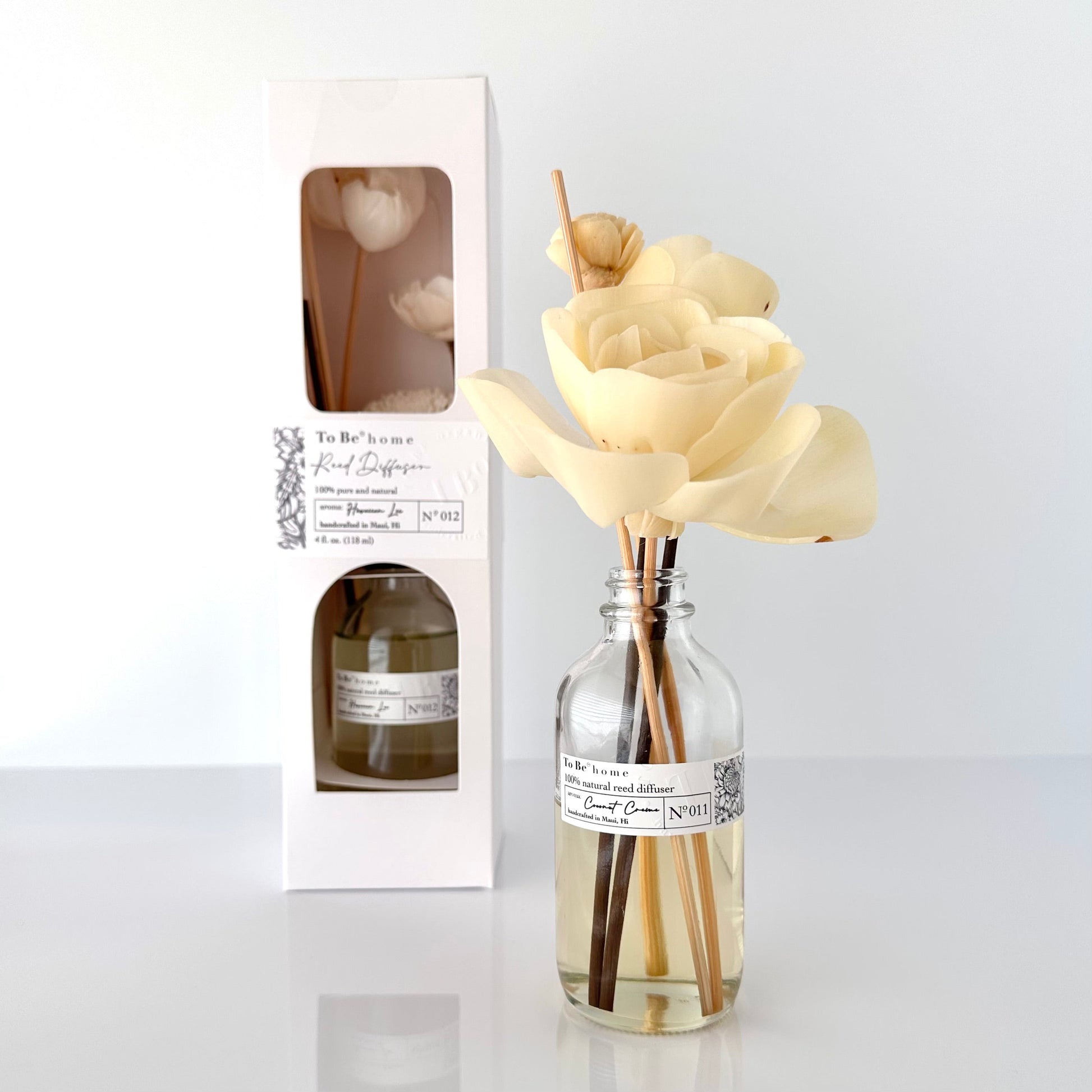Add aroma and a touch of Elegance with this beautiful reed diffuser. Adorned with handcrafted wood flowers that beautifully diffuse all day long.