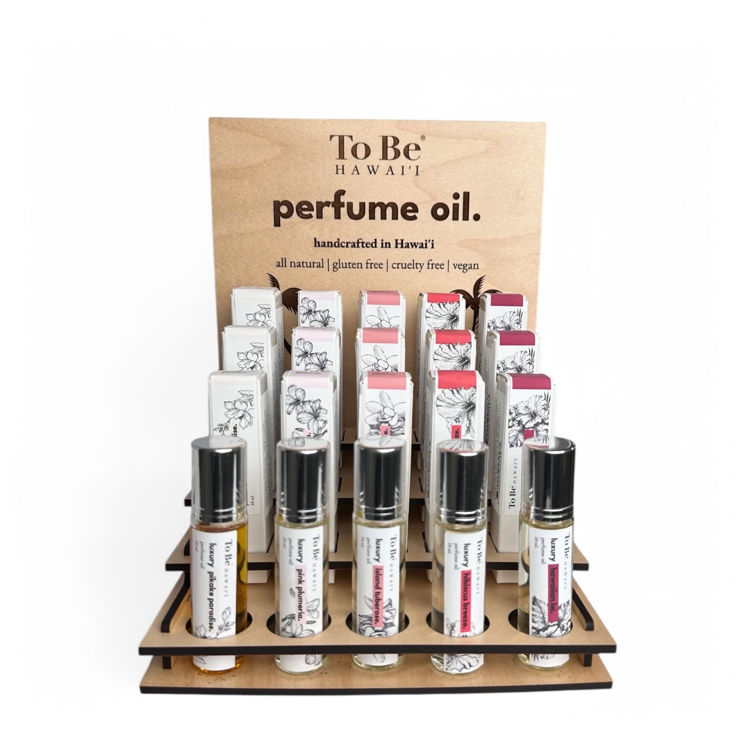 Comes with 15 retail (3 of each fragrance) and 5 comp testers plus display ($30 value). Made from Maple wood, this beautiful display will fit seamlessly into any decor.