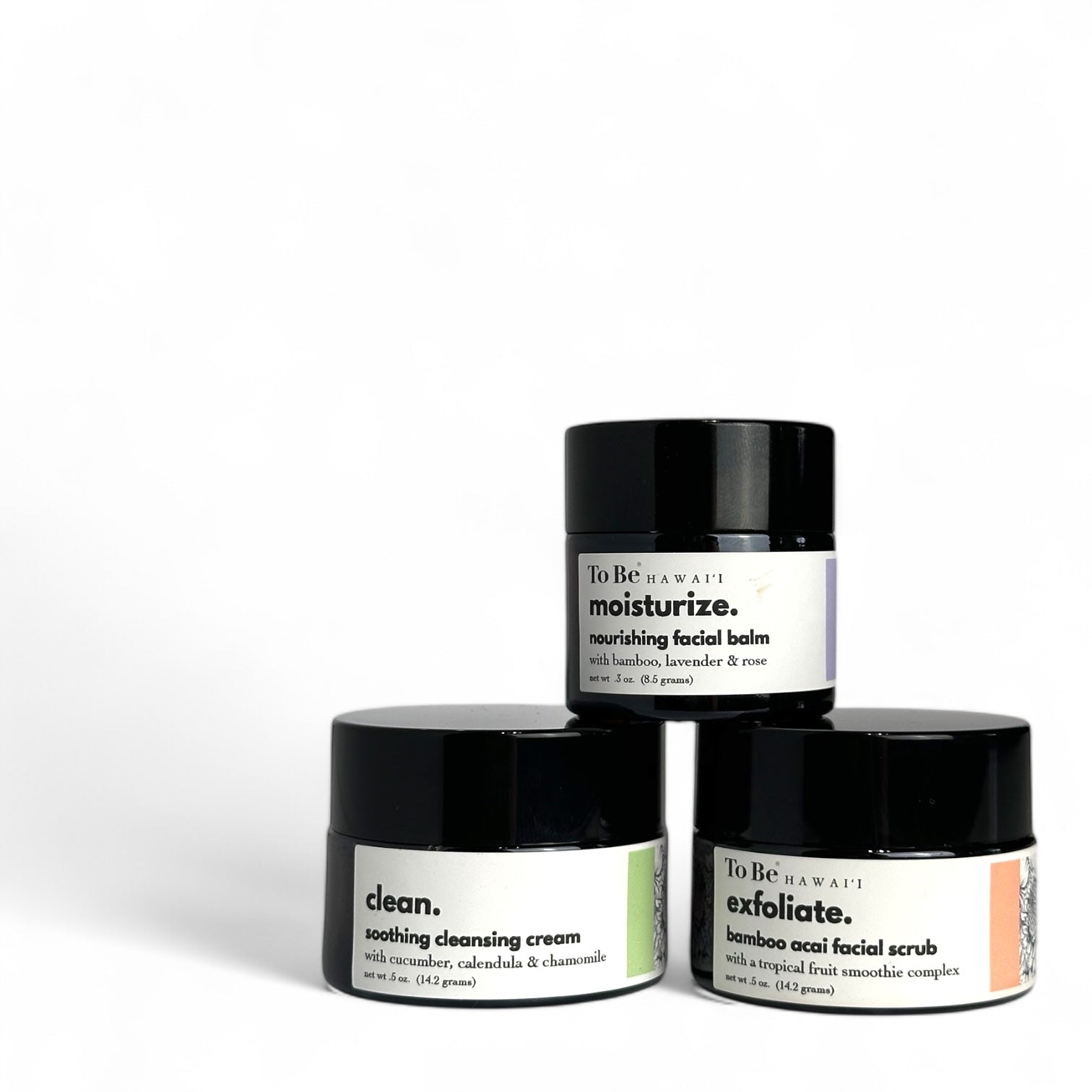Discover great skin with our complete collection of travel size skin care essentials. Comes with our best selling cleanser, scrub and nourishing facial balm. A great travel companion and a great way to try our skincare line!